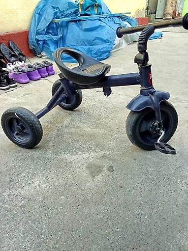 - Трехколесный велосипед с педалями на переднем колесе, пластиковой седушкой и рулем с упором.
