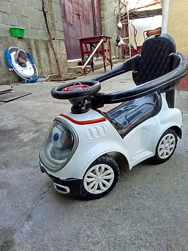 - Машинка-каталка с рулем и защитным бортиком. Пластиковый кузов, широкие колеса, спинка с поддержкой, площадка для ног, звуковые кнопки на руле.