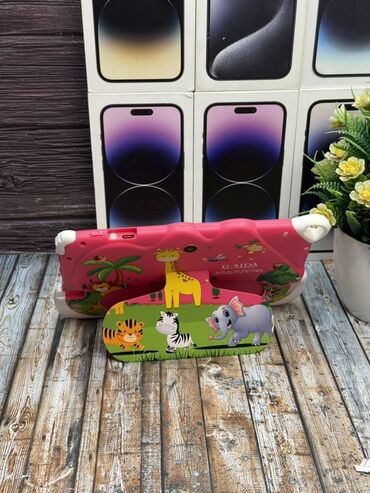Комплектация по фото: планшет в силиконовом бампере с откидной подставкой. Цвет — розовый с белыми акцентами и рисунком животных.