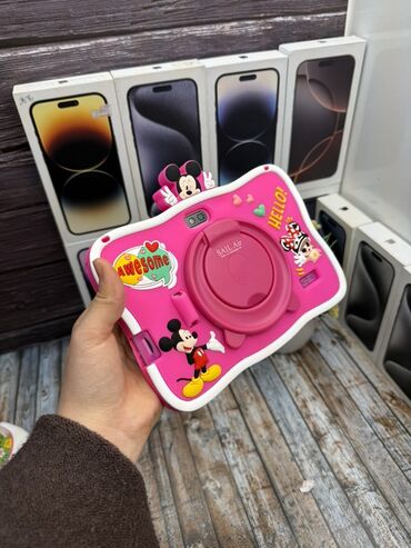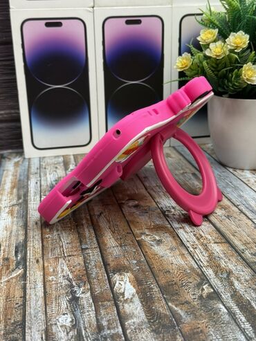 - Прочный детский корпус: ударозащитный силиконовый бампер, розовый цвет, декоративные элементы с мультяшными персонажами.