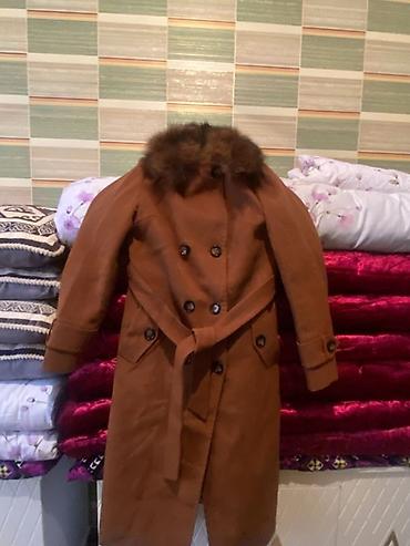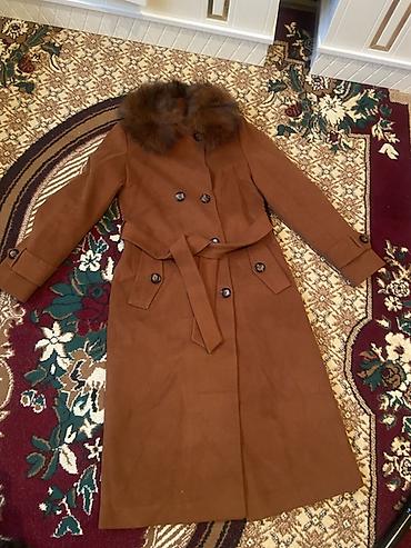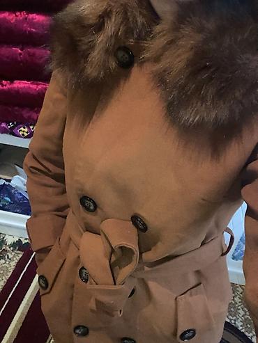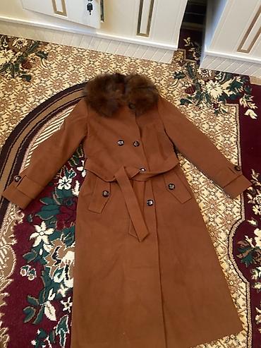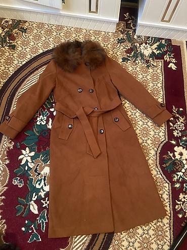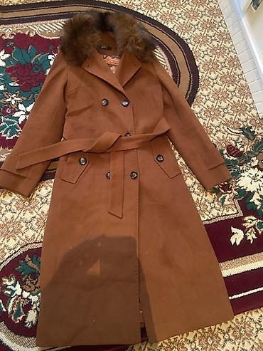 Двубортное женское пальто-тренч карамельного (терракотового) цвета с поясом и меховым воротником.