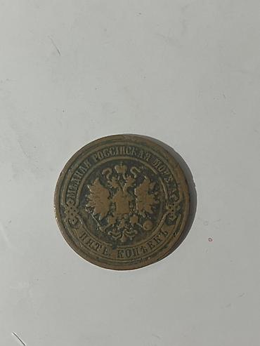 Монета 5 копеек (Е.М.), Российская империя. Медная крупная монета с двуглавым орлом на аверсе и1874 года и надписью «5 копеек» на реверсе, ниже — буквенный знак монетного двора «Е.М.». Видны характ...