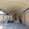 Навес из металла с полупрозрачной крышей. Конструкция состоит из столбов и балок из окрашенного металла, поддерживающих плоскую крышу из полупрозрачного материала. Навес может быть использован для ...