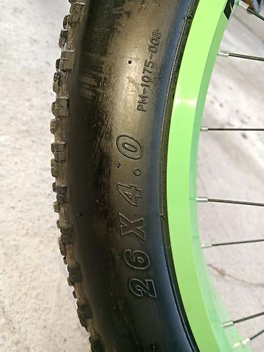 - Колеса: 26" с широкими ободами ярко‑зеленого цвета.