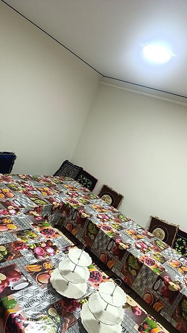 - Просторная столовая комната: длинные застеленные столы, яркое потолочное освещение, подушки для сидения у стен, многоярусные блюда-подставки для сервировки.
