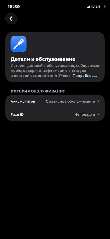 Скриншоты “Об этом устройстве” и “Детали и обслуживание” приложены. В разделе обслуживания отмечено: аккумулятор — “Сервисное обслуживание”, Face ID — “Неполадка”. На фото экрана видна горизонтальная полоса в верхней части.