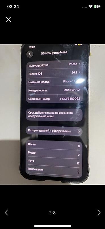 IPhone 12 Pro, модель MGMP3KH/A. На устройстве установлена iOS 16.2. В меню «Об этом устройстве» отображается серийный номер F17DF63R0D92. В разделе «Детали и обслуживание» указано: по аккумулятору — «Неизвестно», по дисплею — «Неизвестно».