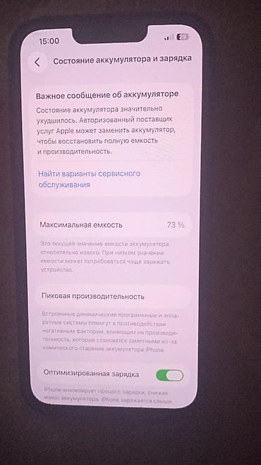 - Аккумулятор: в настройках показано «Максимальная ёмкость — 73%», уведомление о необходимости сервисной замены для восстановления полной автономности.