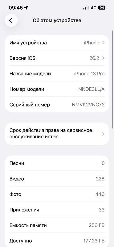 - Модель по системе: iPhone 13 Pro, номер модели NNDE3LL/A, серийный номер NMVK2VNC72 (виден на скрине).