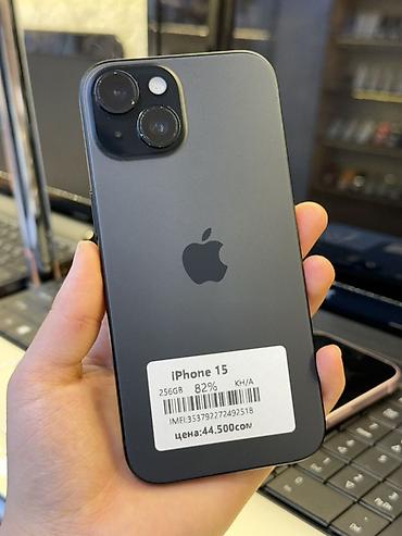 IPhone 15, Б/у, 256 ГБ, Графит, Зарядное устройство, Защитное стекло, Чехол, В рассрочку, 82 %