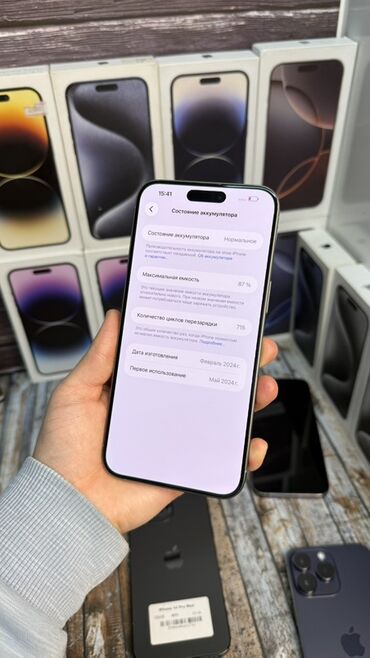 - На экране в настройках: максимальная ёмкость аккумулятора 87%, 715 циклов, изготовление батареи — февраль 2024, первое использование — май 2024.