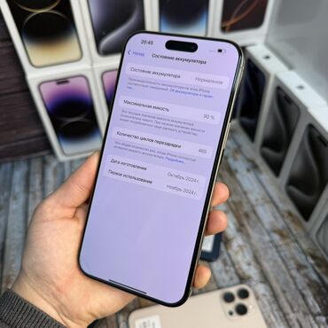 IPhone 15 Pro Max, 256 ГБ, цвет Natural Titanium (светлый). На наклейке: емкость аккумулятора 90%, регион J/A.