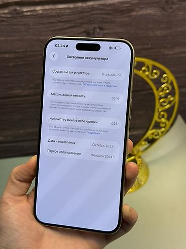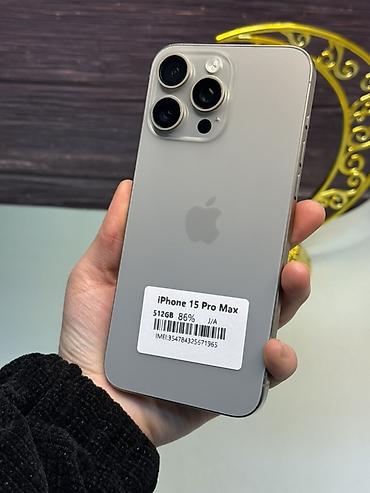 IPhone 15 Pro Max, 512 ГБ, титановый корпус (Natural Titanium). На наклейке указаны: емкость аккумулятора 86% и IMEI 65.