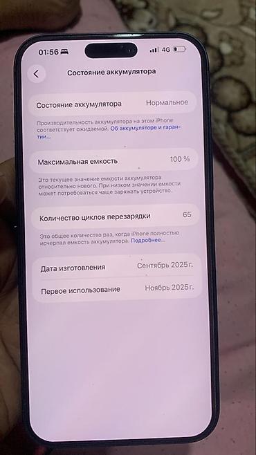 - Состояние аккумулятора по скриншоту: максимальная емкость 100%, количество циклов перезарядки 65