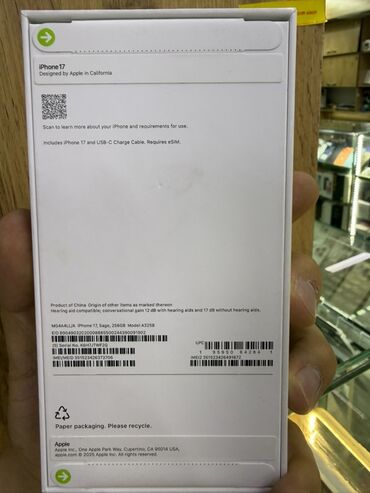 IPhone 17, 256 ГБ, цвет Sage (зелёный). Модель A3528, артикул MG444LL/A. Упаковка с маркировками и серийными/IMEI на коробке.