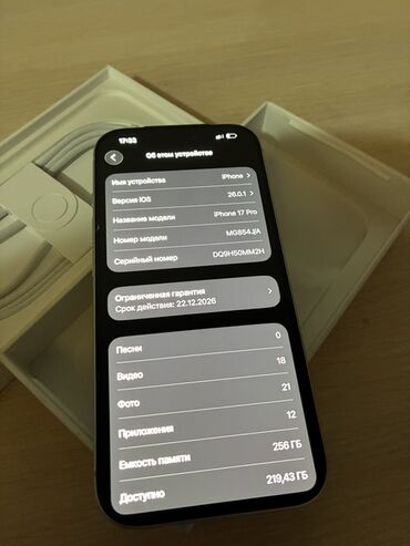 IPhone 17 Pro, 256 ГБ, цвет тёмно‑синий Характеристики и особенности: - Память: 256 ГБ (доступно ~236,7 ГБ на момент снимков экрана). - Экран с Dynamic Island. - Тройная система камер с вспышкой. ...