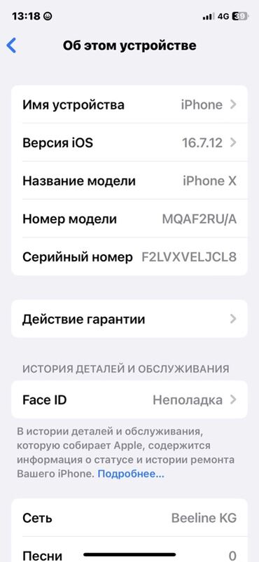 IPhone X, 256 ГБ, iOS 16.6 Характеристики: - Модель: iPhone X (номер модели MQAG2KH/A) - Память: 256 ГБ (доступно около 232,46 ГБ) - Серийный номер: G6WVNP5BJCL9 (отображается в настройках) - Верс...