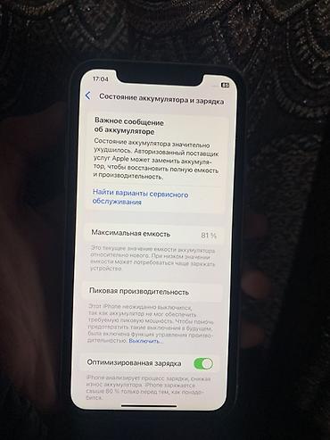 - Состояние аккумулятора по системному сообщению: максимальная емкость 81%; система сообщает о заметном ухудшении и рекомендует замену для восстановления полной емкости, включено управление производительностью; включена «Оптимизированная зарядка»