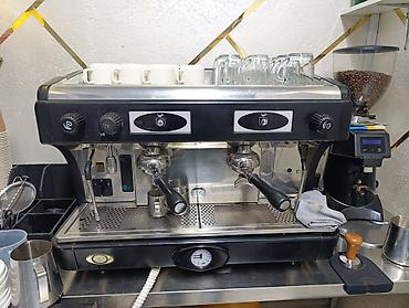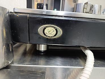 - Двухгруппная рожковая эспрессо-машина с бойлером, манометром на панели и площадкой под прогрев чашек.