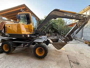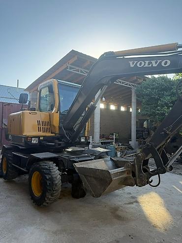 Колесный экскаватор Volvo Основные характеристики: - Марка/модель: Volvo, колесный экскаватор - Ходовая часть: 4 оси, пневмоколёса, передний отвал/лопата-отвал - Рабочее оборудование: ковш с зубья...