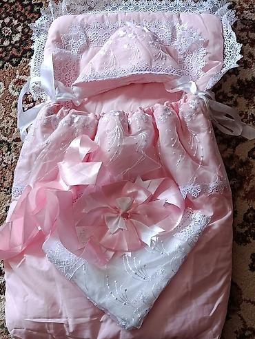 - Праздничный конверт на выписку: розовый сатин с вышивкой и кружевом, внутренняя мягкая подкладка, капюшон, завязки по бокам, бело‑розовый бант и кружевной уголок-плед.