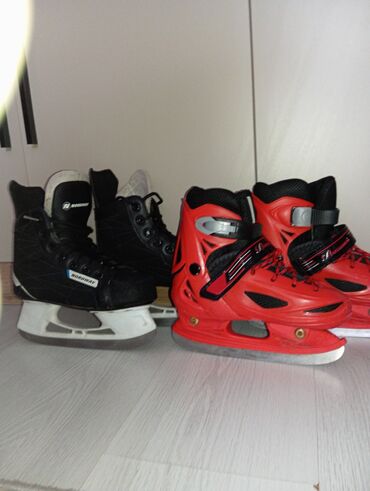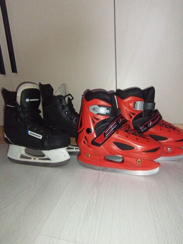 - Пара 2: красные коньки с комбинированной фиксацией (шнуровка + верхняя застёжка-бакля), вентиляционные вставки, жёсткий корпус, стальные лезвия на платформе с декоративными элементами.