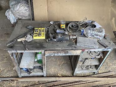 - Металлический верстак с полками и набором расходников/оснастки: конуса/втулки для балансировочного станка, пневмогайковерт, торцевые головки, мелкий инструмент.