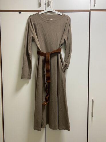 - Платье UNIQLO XL в коричневом тоне с ремнем для деликатного акцента.