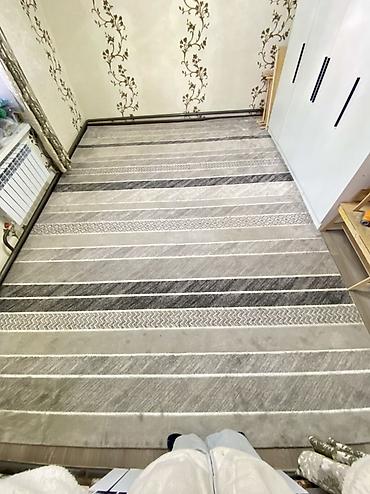 Современный ковер большого формата с полосатым геометрическим узором в спокойной нейтральной гамме. Подходит для гостиной, спальни или кабинета, визуально расширяет пространство и легко сочетается с разными интерьерами. Мягкий ворс, аккуратная кромка с оверлоком, практичная расцветка, скрывающая следы шагов.
