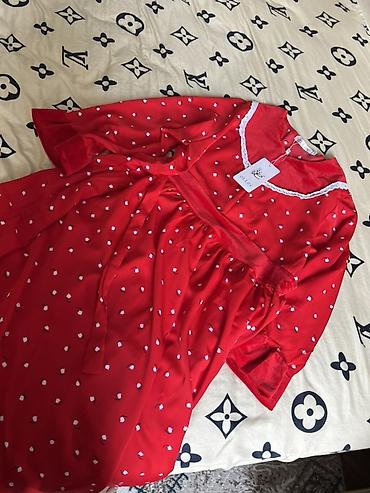 - Яркое красное платье с мелким белым принтом.