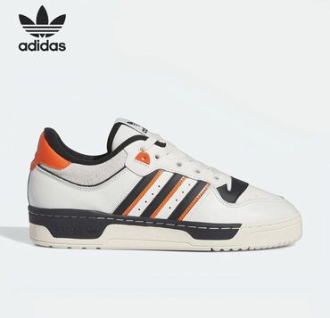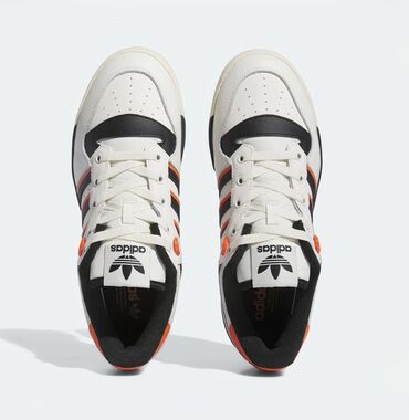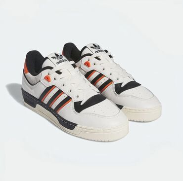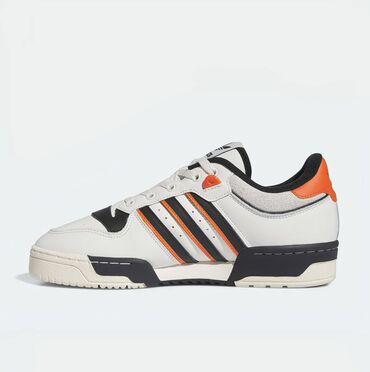 - Дизайн: низкий силуэт в стиле ретро-баскетбола. Белая основа с черными вставками и оранжевыми акцентами, фирменные три полоски по бокам, логотип Trefoil на язычке и подошве.