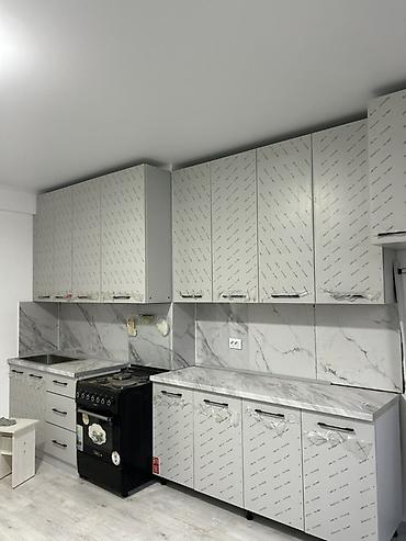 - Столешницы: ламинированные, под светлый мрамор; влагостойкое покрытие, удобное для ежедневной уборки.