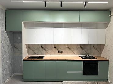 - Прямая планировка на всю стену: нижний ряд тумб в матовом мятно‑зелёном цвете, верхний — глянцевые белые фасады до потолка плюс надстройка в цвет низа для максимального хранения.