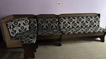 - Угловая скамья из ЛДСП с мягкими спинками и сиденьями. Обивка тканевая, серо‑чёрная с цветочным узором. Состоит из трёх секций: угловой модуль, средний участок и длинная прямая часть.