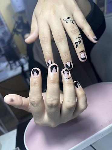 - Дизайн по запросу: минималистичные рисунки, геометрия, точки, контрастный черный декор, акценты стразами.