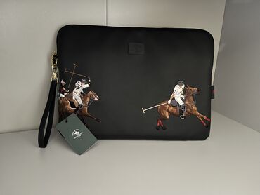 1) Папка/клатч для ноутбука или документов с ремешком на запястье. Материал: гладкая эко‑кожа. Молния по периметру. Декор: крупные нашивки с игроками в поло, фирменный шеврон на лицевой стороне. Внутри мягкая подкладка, подходит для переноски ноутбука/планшета, документов формата А4. Съёмный ремешок с карабином.