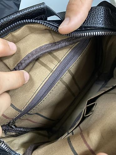 - Внутри подкладка с принтом, есть внутренние карманы: один на молнии и открытые секции для телефона/мелочей.
