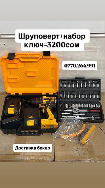 - Шуруповерт + набор ключей/головок в кейсе (желтый кейс). Цена на фото: 3200 сом.