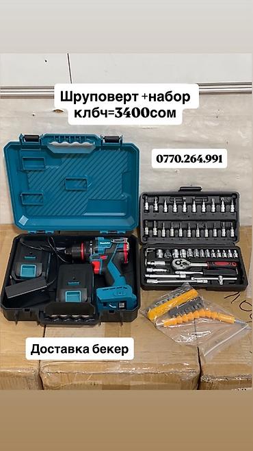 - Шуруповерт + набор ключей/головок в кейсе (бирюзовый кейс). Цена на фото: 3400 сом.