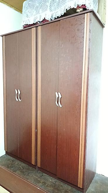 1) Шкаф-купе/распашной четырехдверный, цвет тёмное дерево с декоративными вставками. Металлические ручки, классический прямой корпус. Подходит для спальни или прихожей, вместительный.