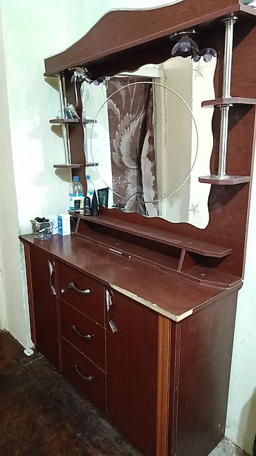 2) Туалетный столик/трюмо в том же цвете: широкая столешница, овальное зеркало, верхний козырёк, боковые полочки на металлических стойках, выкатные ящики и тумбы с ручками под хром. Удобен для косметики и аксессуаров, есть открытая длинная ниша.