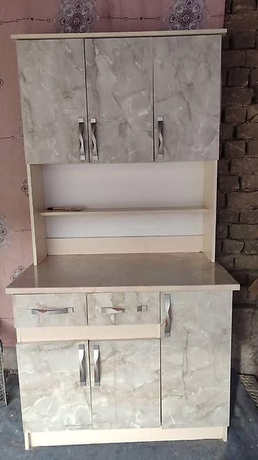 3) Кухонный буфет светлый, под «мрамор»: верхний шкаф с тремя дверцами и открытой полкой, рабочая столешница, снизу два выдвижных ящика и тумбы с распашными дверцами. Компактный и функциональный для хранения посуды и продуктов.