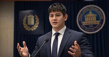 - Деловая тематика: спикер в костюме у микрофона на фоне эмблем и фона конференц-зала.