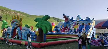 - Многоуровневая зона активности: горки разной высоты, лазалки, тоннели, надувные фигуры для объезда/перепрыгивания.