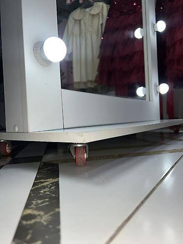 - Формат: большое напольное зеркало в белой раме, классический гримерный стиль.
