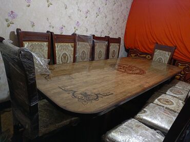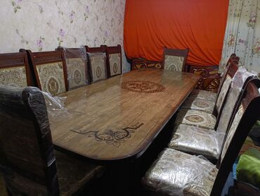 Представляем обеденный гарнитур, состоящий из прямоугольного стола и десяти стульев. Стол выполнен под дерево с глянцевой поверхностью, украшенной центральным декоративным узором и орнаментом по углам. Стулья имеют высокие спинки с резными деревянными элементами и мягкие сиденья с обивкой светлого оттенка, украшенной узором. Этот комплект идеально подойдет для просторной столовой или гостиной, обеспечивая комфортное размещение большой компании.