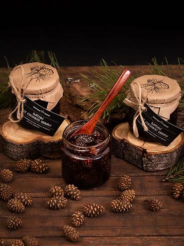 - Варенье из сосновой шишки — густой сироп с целыми молодыми шишками. Аромат хвои, смолистые ноты, десертная сладость.