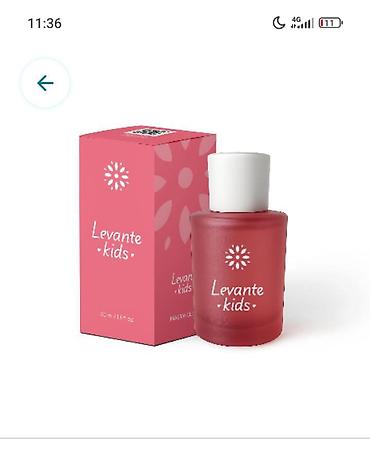 - Флакон: матовое розово‑красное стекло с белой крышкой; фирменная коробка Levante Kids в тон.