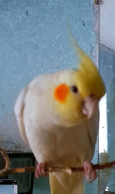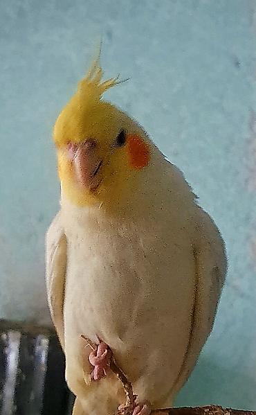 Корелла (нимфа) светлой окраски с яркими оранжевыми «щёчками» и хохолком. Спокойная декоративная птица для дома.