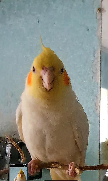 Корелла (нимфа), окрас «жемчуг». Домашняя ручная птица с выразительным хохолком и яркими оранжевыми щечками. Оперение светло‑желтое с контрастным жемчужным рисунком и темными маховыми перьями; длин...